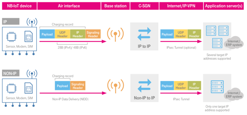 The NB and CatM1 modules support the TCP/IP protocol, but due to the resulting higher data volume, its use is not recommended. Similarly, HTTP and HTTPS cannot be implemented sensibly over the air interface, as they are based on TCP and require additional data volume for their overhead.